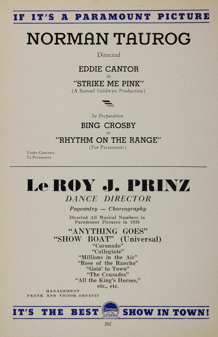 This is an original 1936 two-color print ad for Paramount Pictures featuring Norman Taurog, who directed Eddie Cantor in "Strike Me Pink," a Samuel Goldwyn Production, and Bing Crosby in "Rhythm on the Range"; and LeRoy J. Prinz, dance director who directed all musical numbers in Paramount Pictures in 1935. Some of the many films he worked on include "Anything Goes," "Show Boat," "Coronado," "Collegiate," "Millions in the Air," "Rose of Rancho," "Goin' to Town," "The Crusades," and "All the King's Horses."