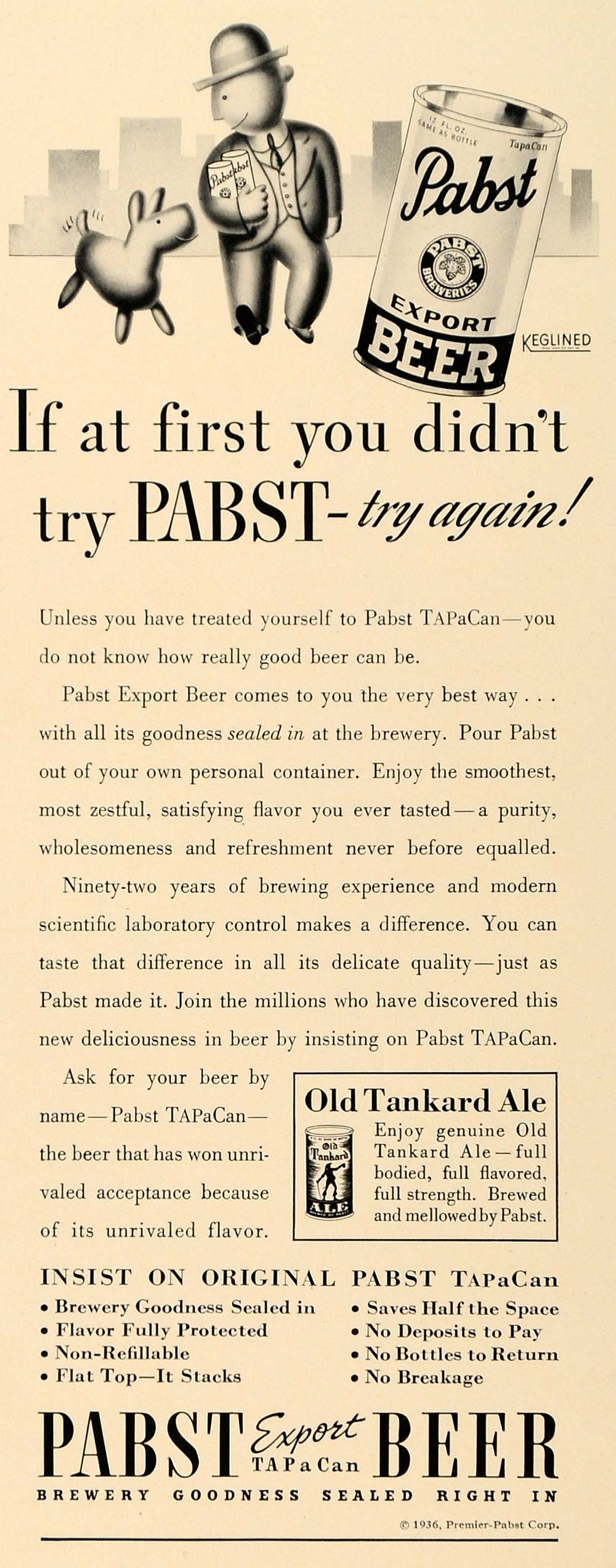1936 Ad Pabst Beer Export Ale Tankard Alcohol Tapacan - ORIGINAL ADVERTISING FT9