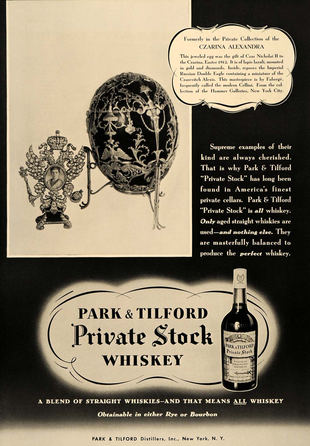 This is an original 1936 black and white print ad for Park & Tilford Private Stock Whiskey. This particular ad features a jeweled egg given to Czarina Alexandra by Czar Nicholai II, as well as a lapis lazuli in gold and diamonds mounted on an Imperial Russian Double Eagle with a photo of the Czarevitch Alexis, which was designed by Feberge, who was commonly referred to as the modern Cellini. Featured items were from from the Hammer Galleries in New York City.