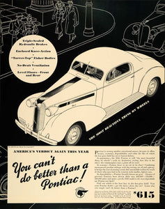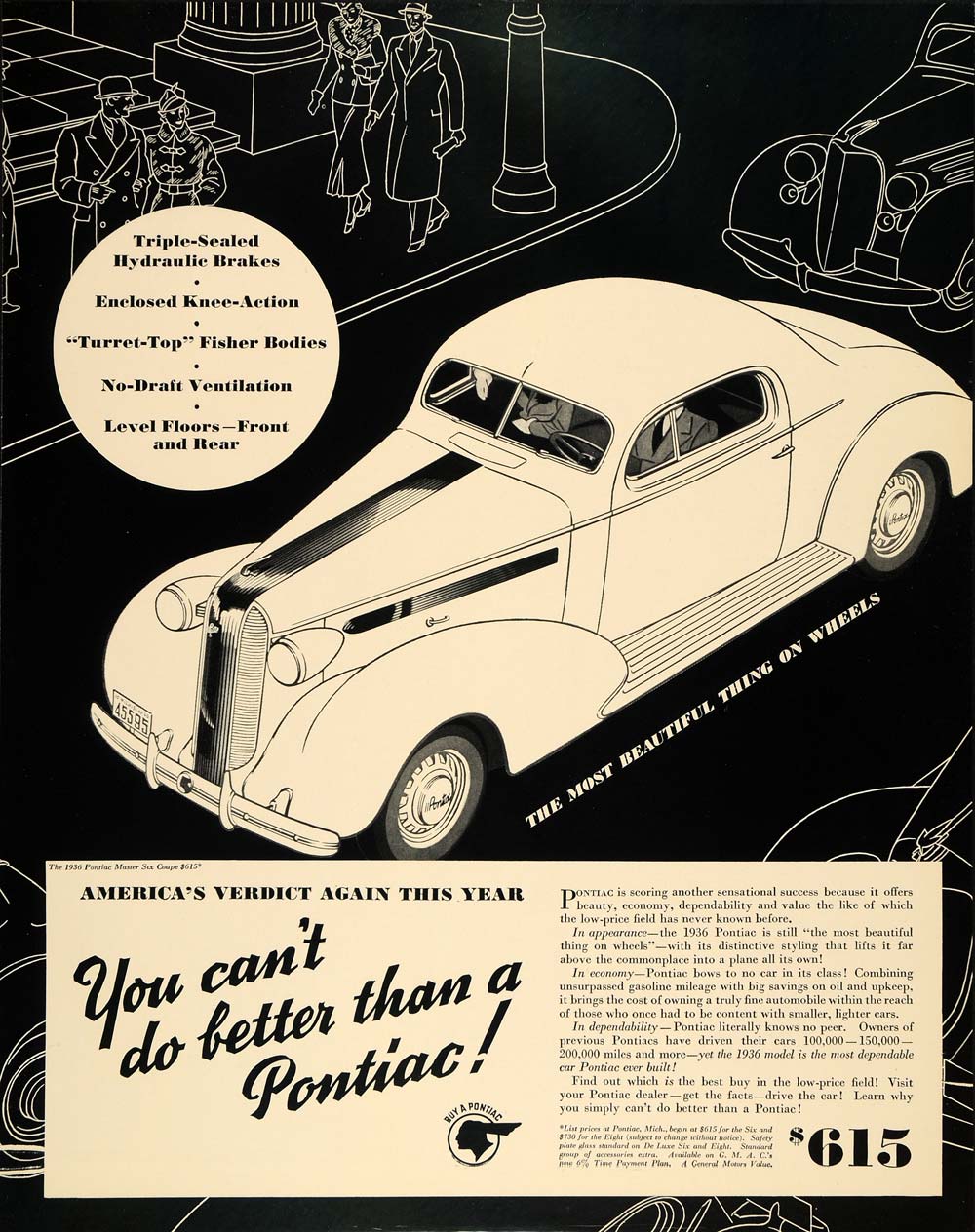 This is an original 1936 black and white print ad for the Pontiac Master Six Coupe automobile.