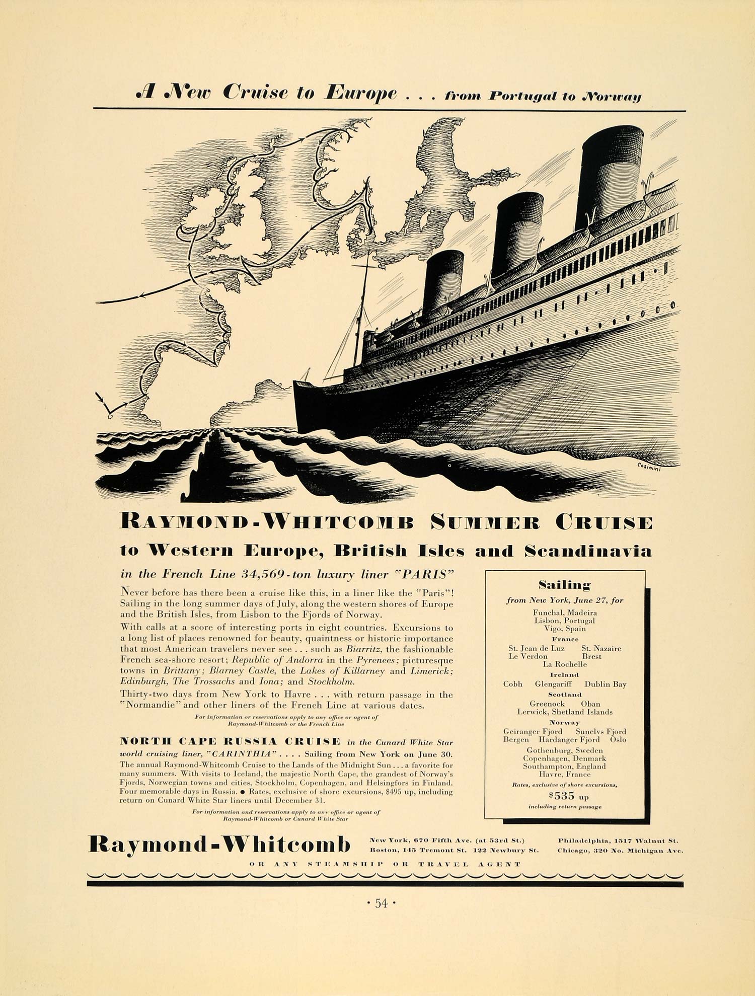 This is an original 1936 black and white print ad for the Raymond-Whitcomb Summer Cruise.