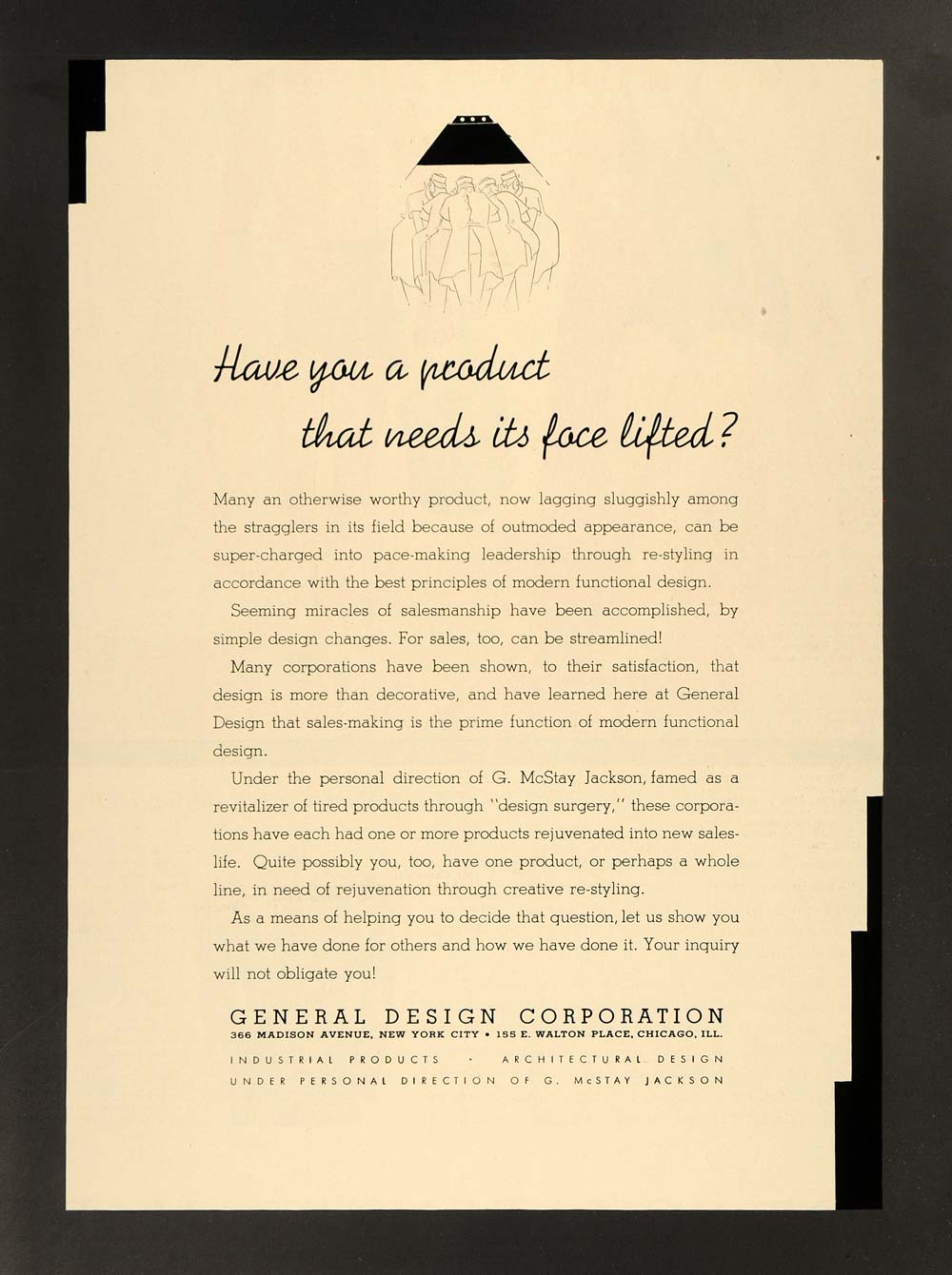 This is an original 1936 color silver-glint print ad for the General Design Corporation, located at 366 Madison Avenue in New York City or at 155 E. Walton Place in Chicago. This company was likely an early business consulting firm, under the direction of G. McStay Jackson.