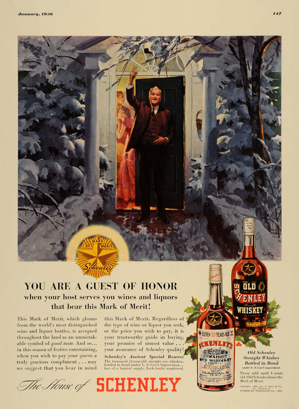 This is an original 1936 color print ad for Schneley Old Whiskey and Ancient Special Reserve Rye Whiskey.