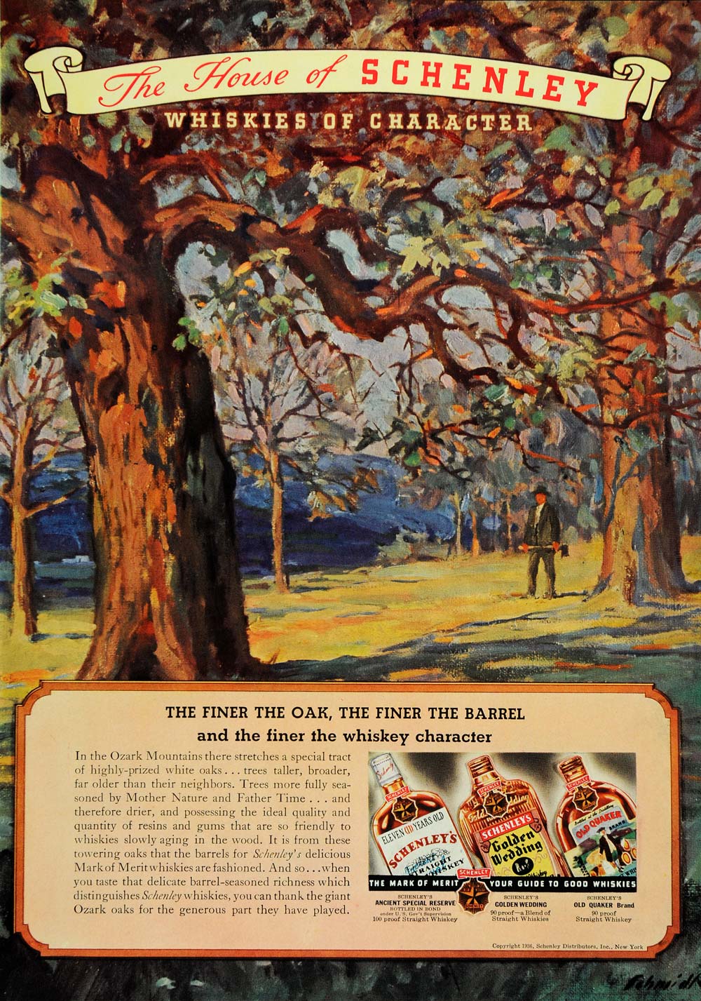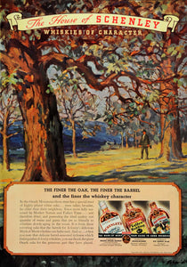 This is an original 1936 color print ad for the Schenley Distributors, Incorporated, of New York, featuring their House of Schenley Whiskies, including their Ancient Special Reserve Straight Whiskey, Golden Wedding, and Old Quaker.