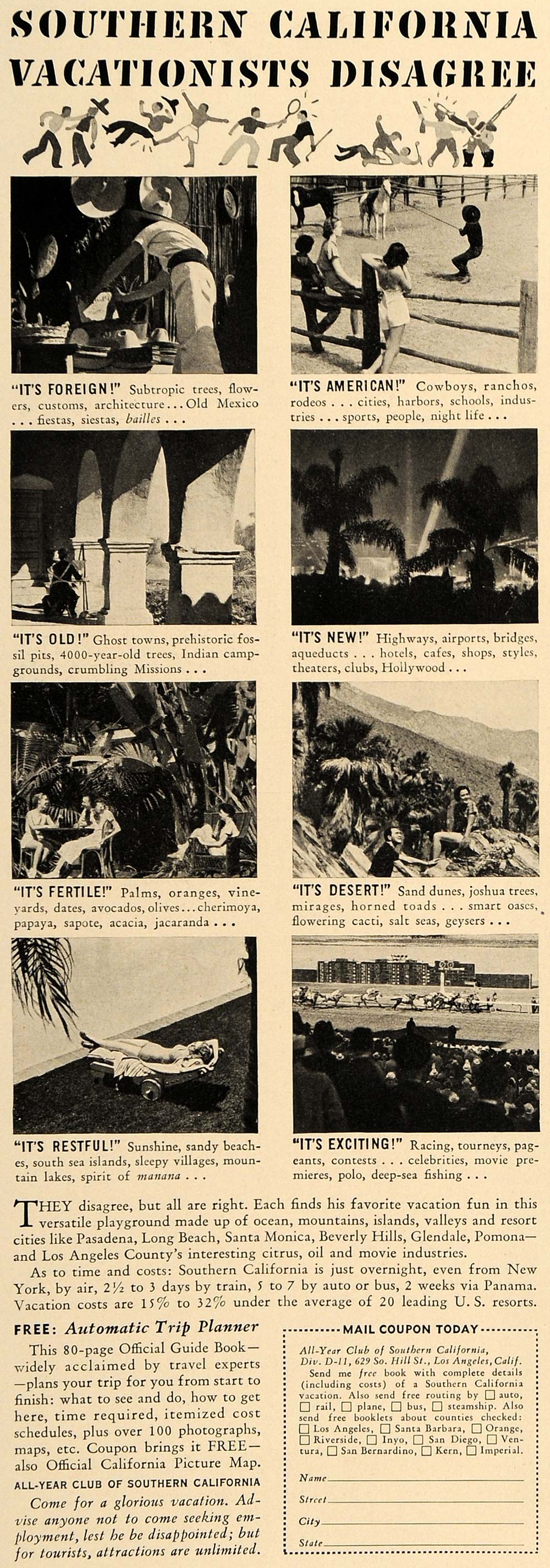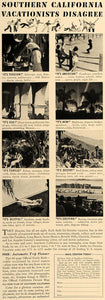 This is an original 1936 black and white print ad for southern California tourism. The ad features images of popular attractions and scenery that can be seen in the region.