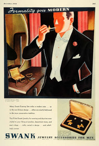 This is an original 1936 black and white print ad for Swank Products, Incorporated, located in Attleboro, Massachusetts, as well as New York, Chicago, Philadelphia, Boston, and Los Angeles. This ad features their Eclipse Evening Set, a collection of cufflinks and men's accessories.