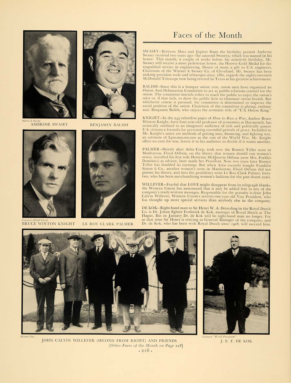 This is an original 1936 black and white print ad of the Faces of the Month. It features images of Ambrose Swasey, Benjamin Balish, Bruce Knight, Le Roy Palmer, John Willever, and J. De Kok.