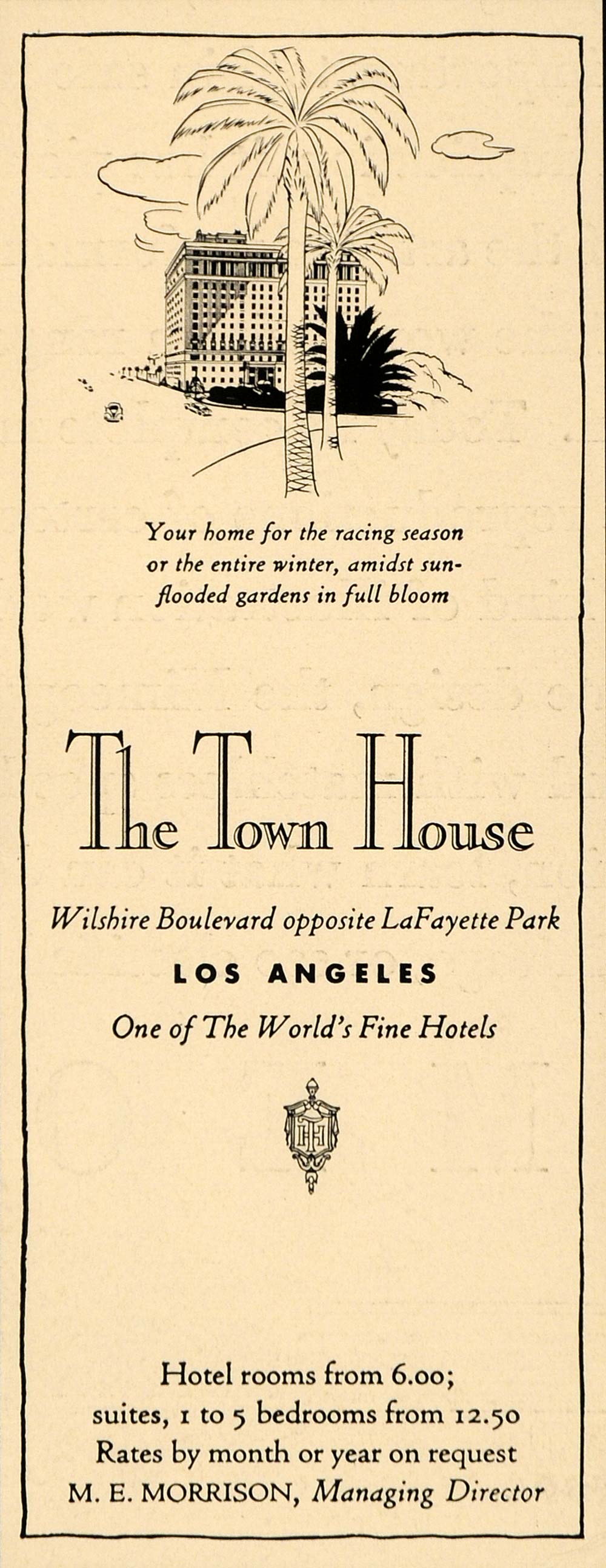 This is an original 1936 black and white print ad for The Town House Hotel located in Los Angeles with M. E. Morrison as the managing director.