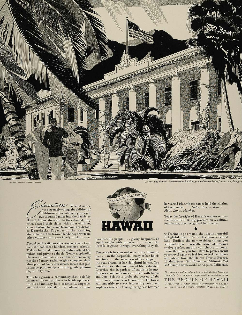 This is an original 1936 black and white print ad for travel to Hawaii with an illustration of the University of Hawaii Administration Building.