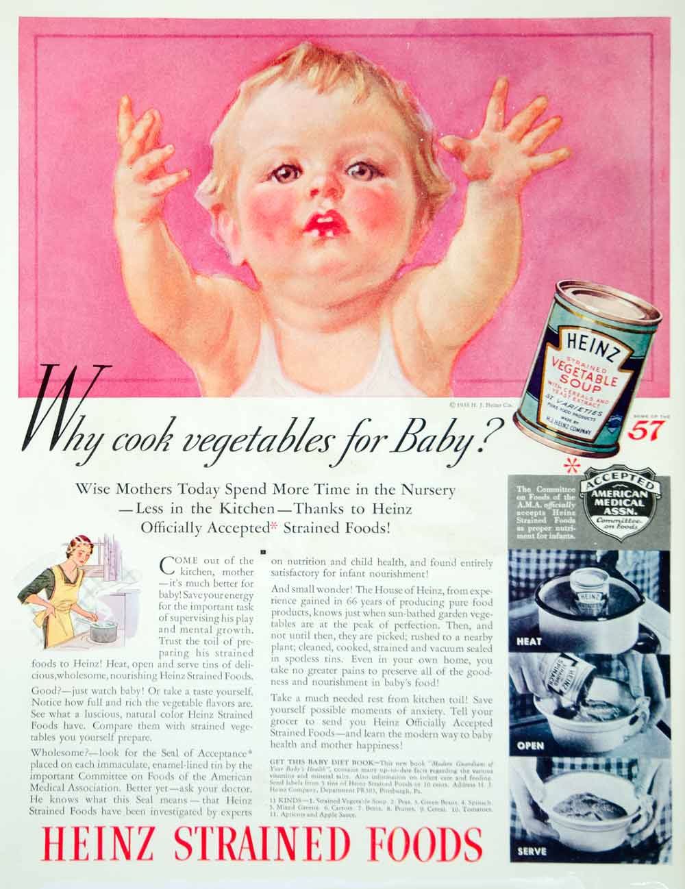 This is an original 1936 color print ad for Heinz Strained Baby Foods.