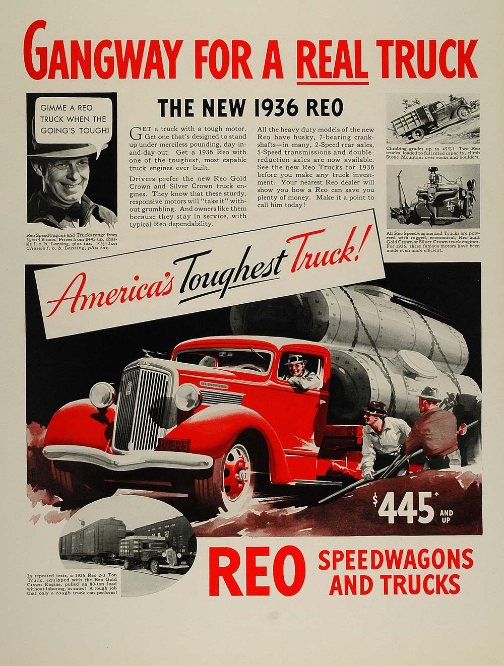 This is an original 1936 two-color print ad for Reo Speedwagons and Trucks equipped with the Reo Gold Crown and Silver Crown truck engines.