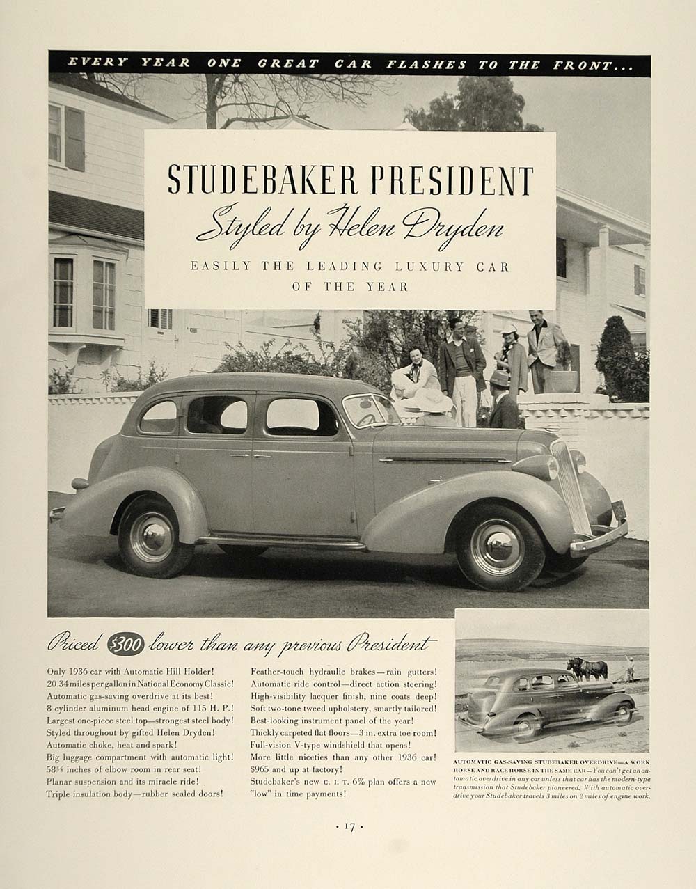 This is an original 1936 black and white print ad for the Studebaker President, a luxury car styled by designer Helen Dryden ($965).