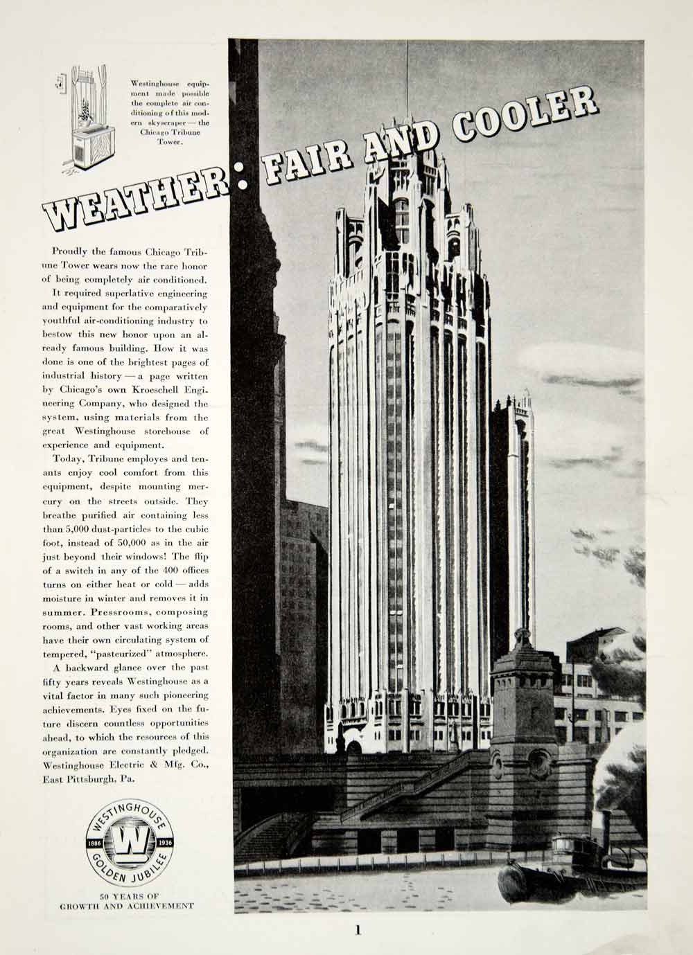 This is an original 1936 Great Depression Era black and white print ad for Westinghouse's Air Conditioning equipment. The Chicago Tribune Tower, a skyscraper with several hundred offices, was one of the first major structures to procure modern air conditioning.