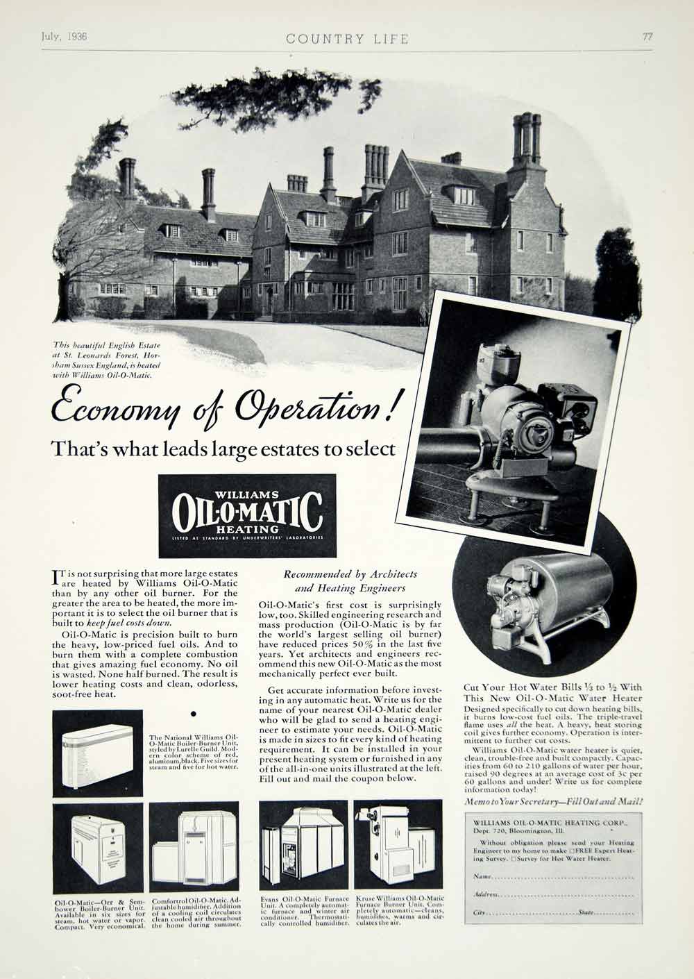 This is an original 1936 black and white print ad for hot water boiler-burner units that were made and sold by the Williams Oil-O-Matic Heating Corporation of Bloomington, Illinois (IL). The ad also featured an illustration of an English estate at St. Leonards Forest in Horsham Sussex, England, UK.