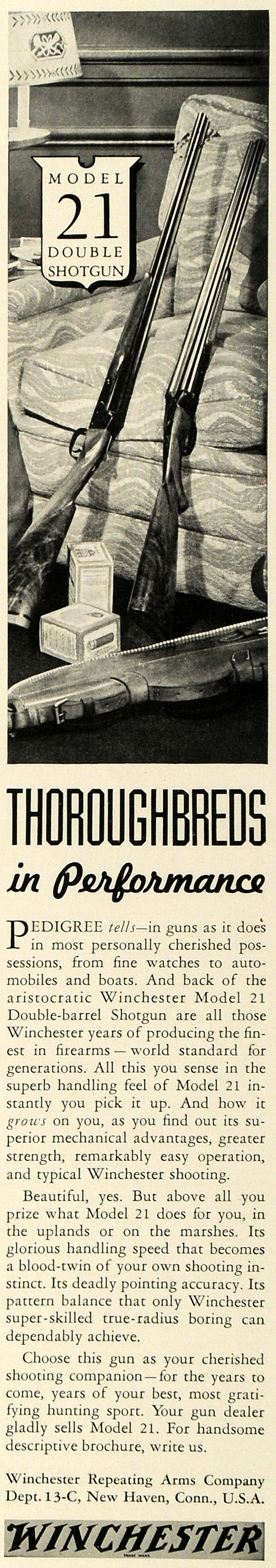 This is a small original 1936 black and white print ad promoting the Winchester Model 21 Double-barrel Shotgun from Winchester Repeating Arms Company located in New Haven, Connecticut.