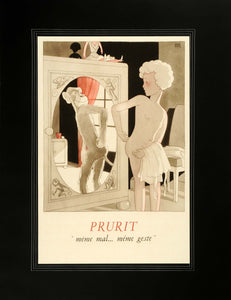 This is an original 1936 two-color, double-sided French print ad for for Dermo-Plastol, a treatment for pruritus or severe itching from Laboratoires Dumesnil, 10 Rue du Platre, Paris. Please note that the front illustration is a two-color tipped-in print. Please see both images.