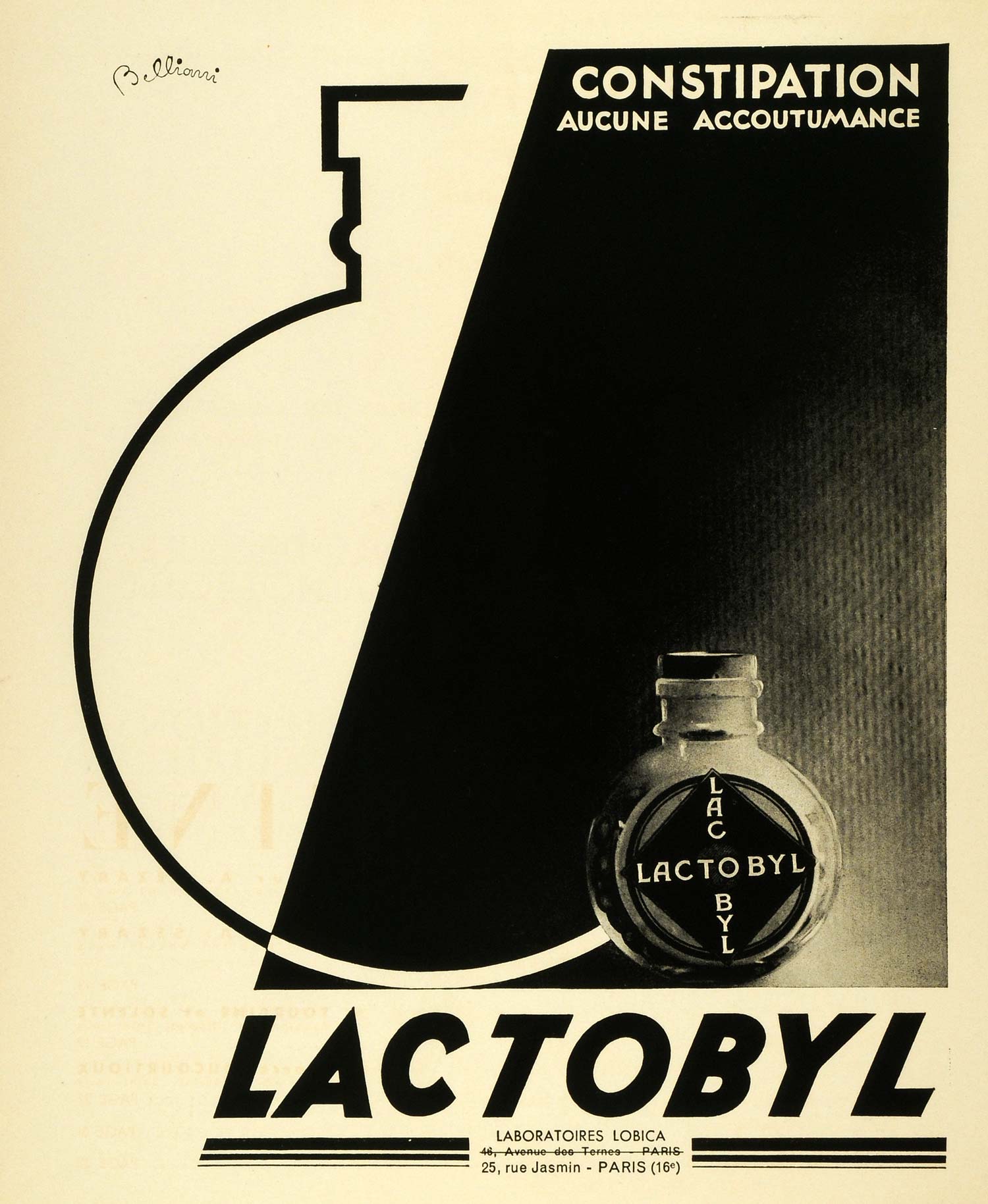 This is an original 1936 black and white French print ad for Lactobyl, a drug preparation for the treatment of constipation, from Laboratoires Lobica, 25, Rue Jasmin, Paris.