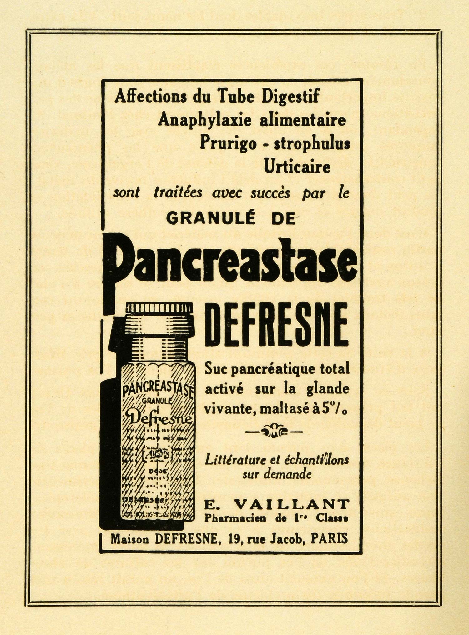 This is an original 1936 black and white print ad for GranulŽ Pancreastase Defresne, a drug treatment for diseases of the digestive tract, from Maison Defresne, 19 Rue Jacob, Paris, France.