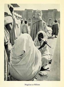 This is an original 1936 black and white halftone print of a magician playing the flute at Meknes in Morocco, Africa. Various earth spirits called