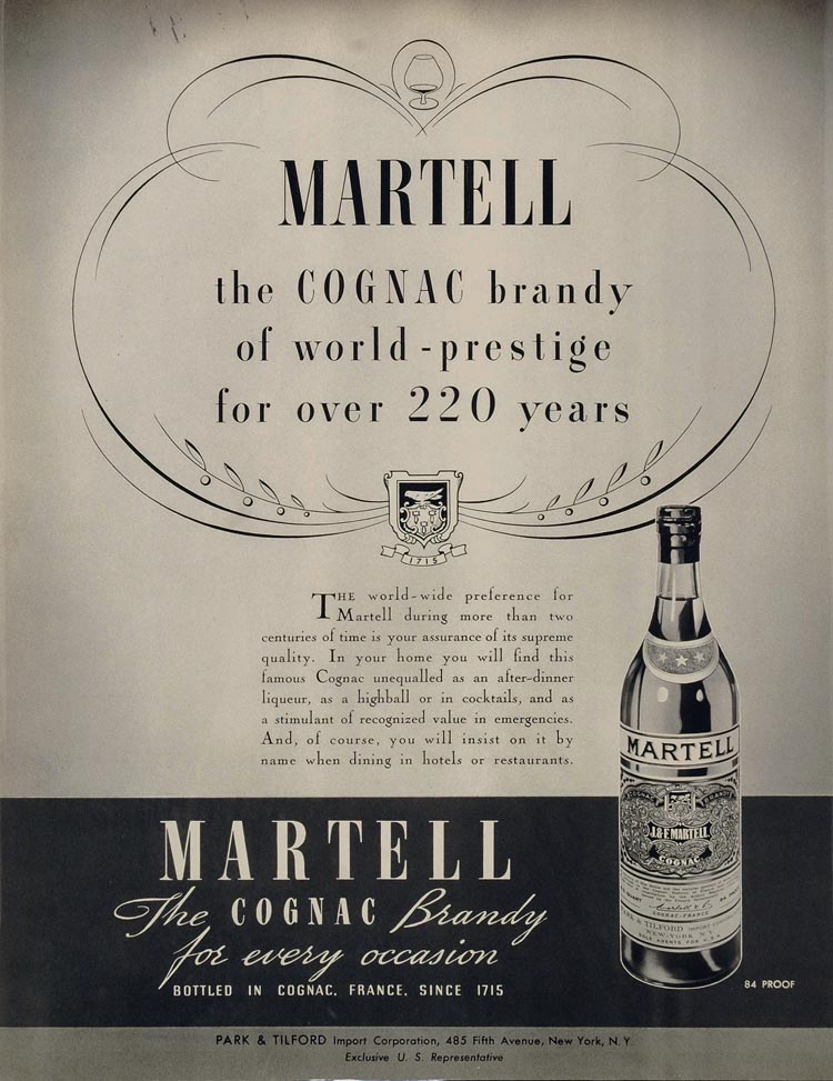 This is an original 1936 print ad for Martell Cognac--"the cognac brandy for every occasion," bottled in Cognac, France since 1715."