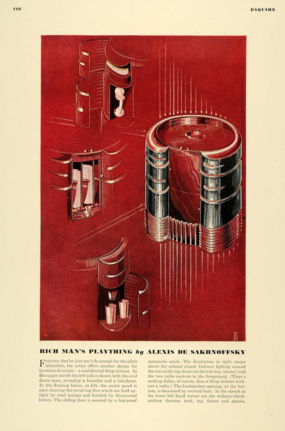 This is an original 1936 color print of a filing cabinet for a rich man by Alexis De Sakhnoffsky. This cabinet has a humidor, a telephone, a radio, an ash tray and a few other trinkets perfect for a rich man.