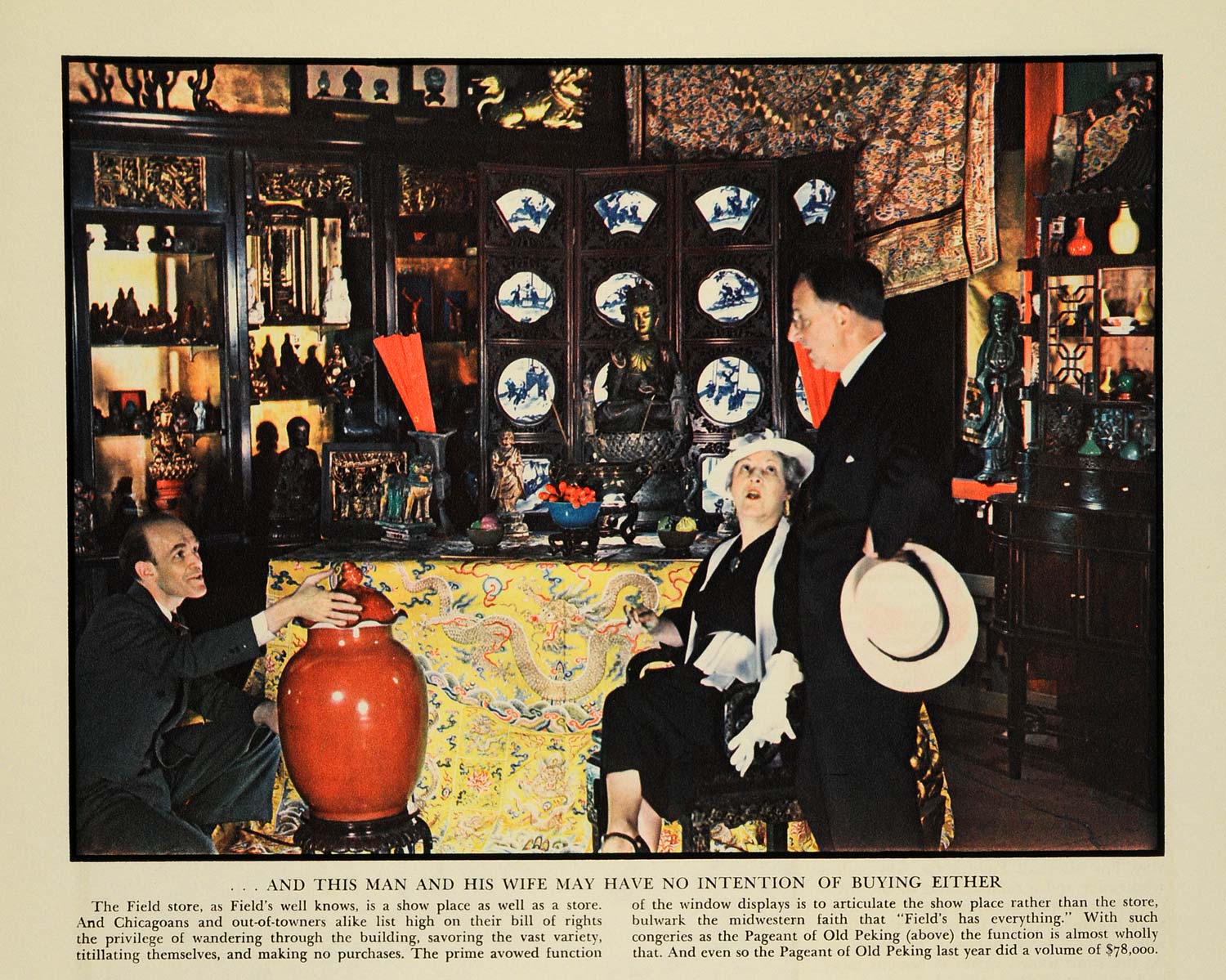This is an original 1936 color print of the interior of a Marshall Field's store. The image features a couple looking at a red vase. The caption writes, "The Field store, as Field's well knows, is a show place as well as a store. And Chicagoans and out-of-towners alike list high on their bill of rights the privilege of wandering through the building, savoring the vast variety, titillating themselves, and making no purchases..."