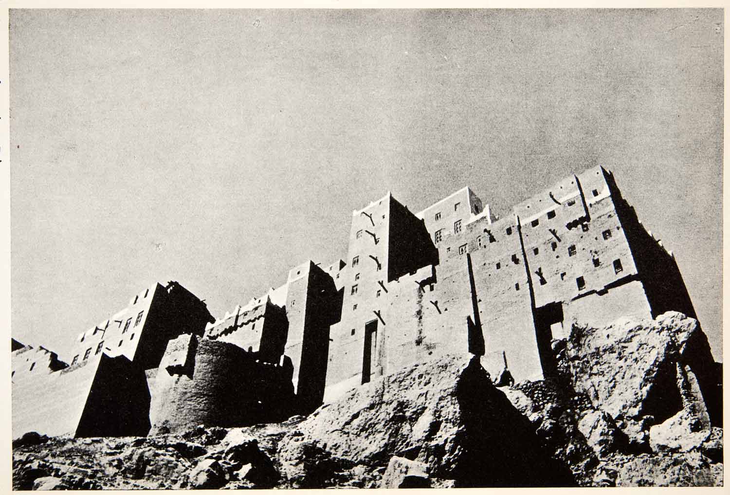 This is an original 1936 black and white halftone print of the fortress of Sana'a in Wadi Do'am, Yemen.
