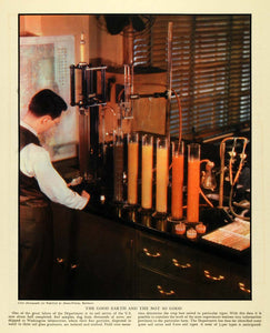 This is an original 1936 color print of a man testing soils at the United States Department of Agriculture. The caption writes, "One of the great labors of the department is its soil survey of the U. S. now about half completed. Soil samples, dug from thousands of acres, are shipped to Washington laboratories, where their fine particles, dispersed in water in these tall glass graduates, are isolated and studied..."