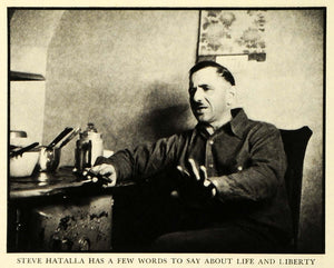 This is an original 1936 halftone print portrait of Steve Hatalla located on 1918 Forster Street, Harrisburg, Pennsylvania. Hatalla originally worked for the Central Construction Corporation but was laid off in November of 1931. After losing his job, he lived on credit, charity, civil works, and direct relief. In late 1935, he was transferred to the Works Progress Administration (WPA), and at the time of this publication, was working as a stonemason to construct the State Insane Hospital. The government paid him $85 a month to do it. The caption writes, "Steve Hatalla has a few words to say about life and liberty." Photography by R. H. Hoffmann.