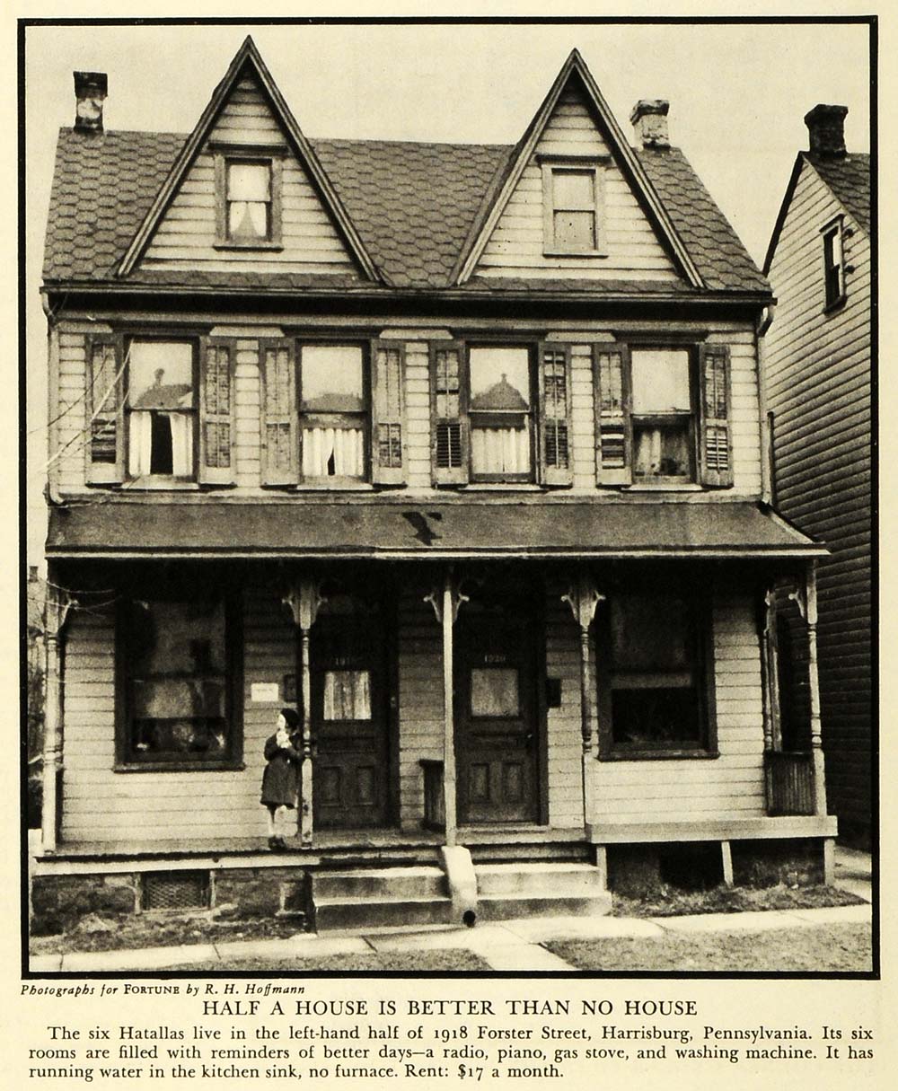 This is an original 1936 halftone print of the home of Steve Hatalla located on 1918 Forster Street, Harrisburg, Pennsylvania. Hatalla originally worked for $200 a month at the Central Construction Corporation but was laid off in November of 1931. After losing his job, he lived on credit, charity, civil works, and direct relief. In late 1935, he was transferred to the Works Progress Administration (WPA), and at the time of this publication, was working as a stonemason to construct the State Insane Hospital. The government paid him $85 a month to do it. The caption writes, "The six Hatallas live in the left-hand half of 1918 Forster Street, Harrisburg, Pennsylvania. Its six rooms are filled with reminders of better days-- a radio, piano, gas stove, and washing machine. It has running water in the kitchen sink, no furnace. Rent: $17 a month." Photography by R. H. Hoffmann.