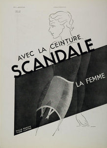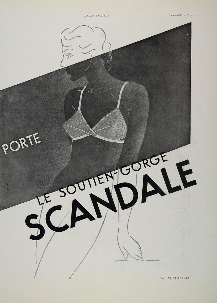 This is an original 1936 black and white, double-page, French print ad for Scandale lingerie. (Please see both images.)