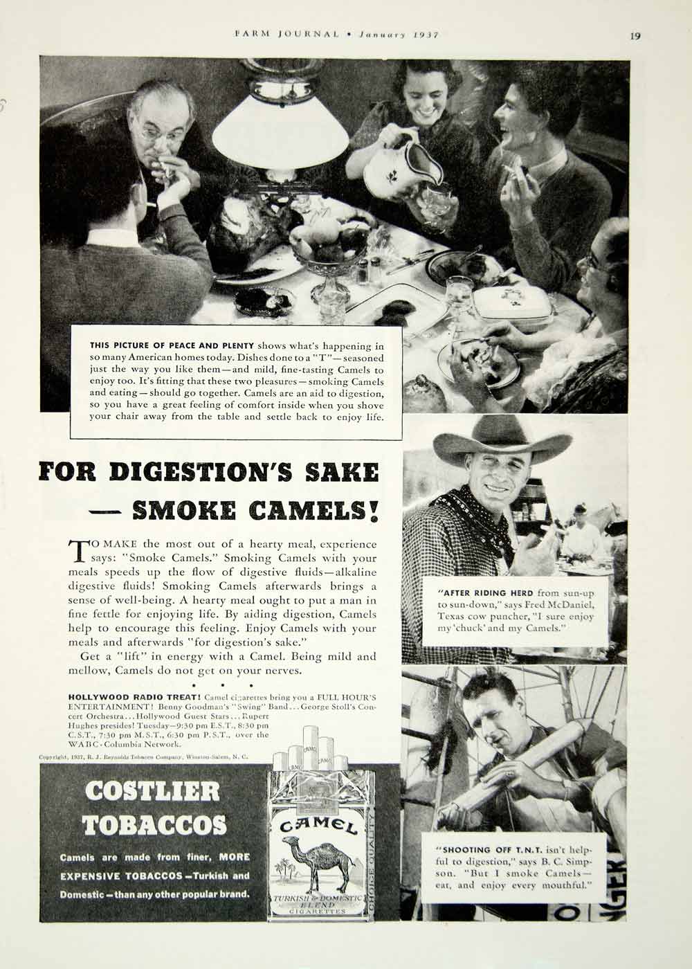 Keywords specific to this image: Vintage Advertising, R.J. Reynolds Tobacco Company, Nicotine, Smoke, Family, Eat, Light, Fred McDaniel, B.C. Simpson, TNT, Explosives Expert, Package, Logo, Dromedary