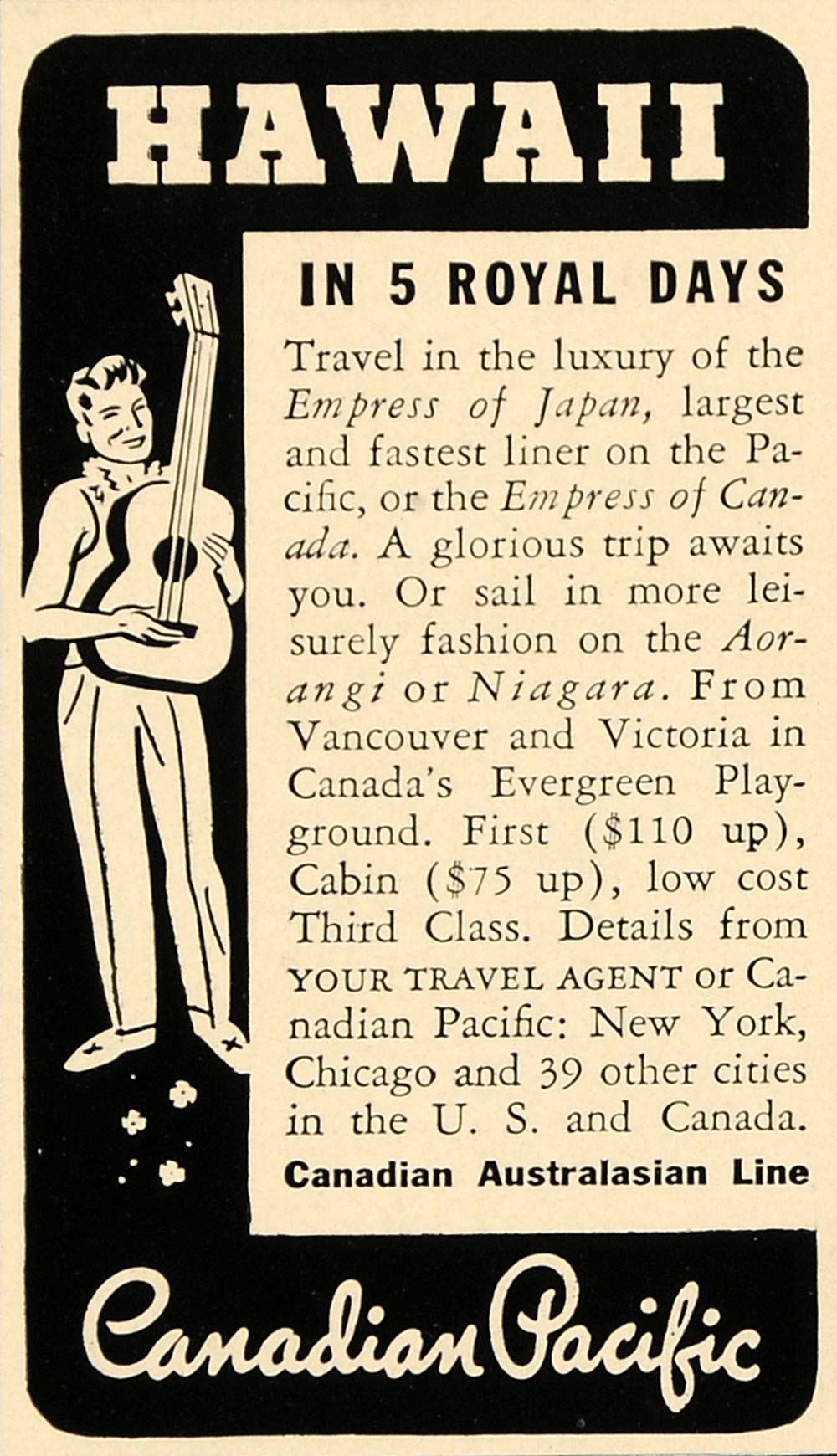 This is an original 1937 black and white print ad for the Canadian Pacific Cruise Line with offices in New York and Chicago. Canadian Pacific ships listed are: Empress of Japan, Empress of Canada, Aorangi, and Niagara.