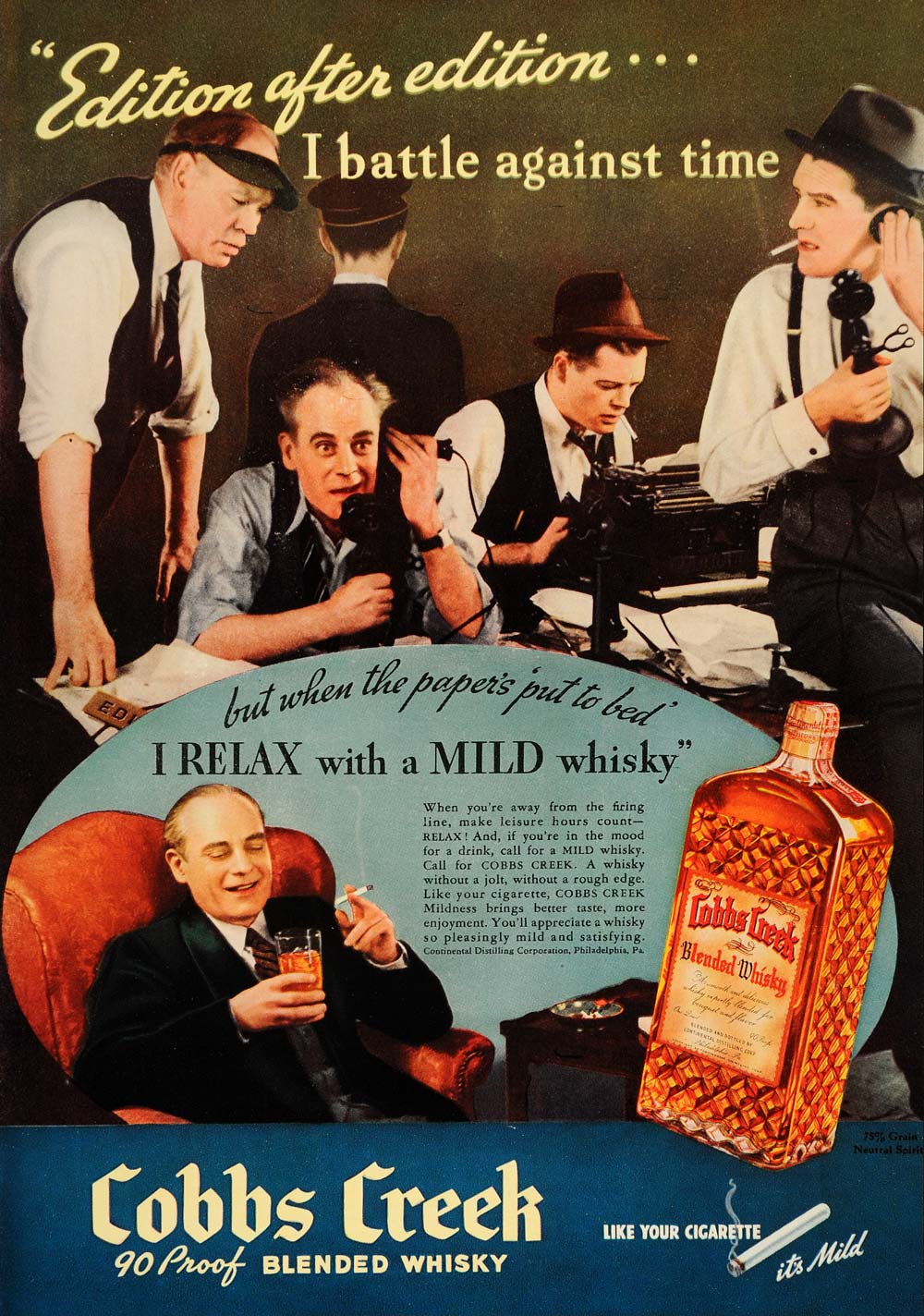 This is an original 1937 color print ad for Cobbs Creek Blended Whisky from the Continental Distilling Corp. located in Philadelphia, Pennsylvania.