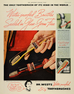 This is an original 1937 color print ad for Dr. West's Water-proofed Toothbrushes by Weco Products Company.