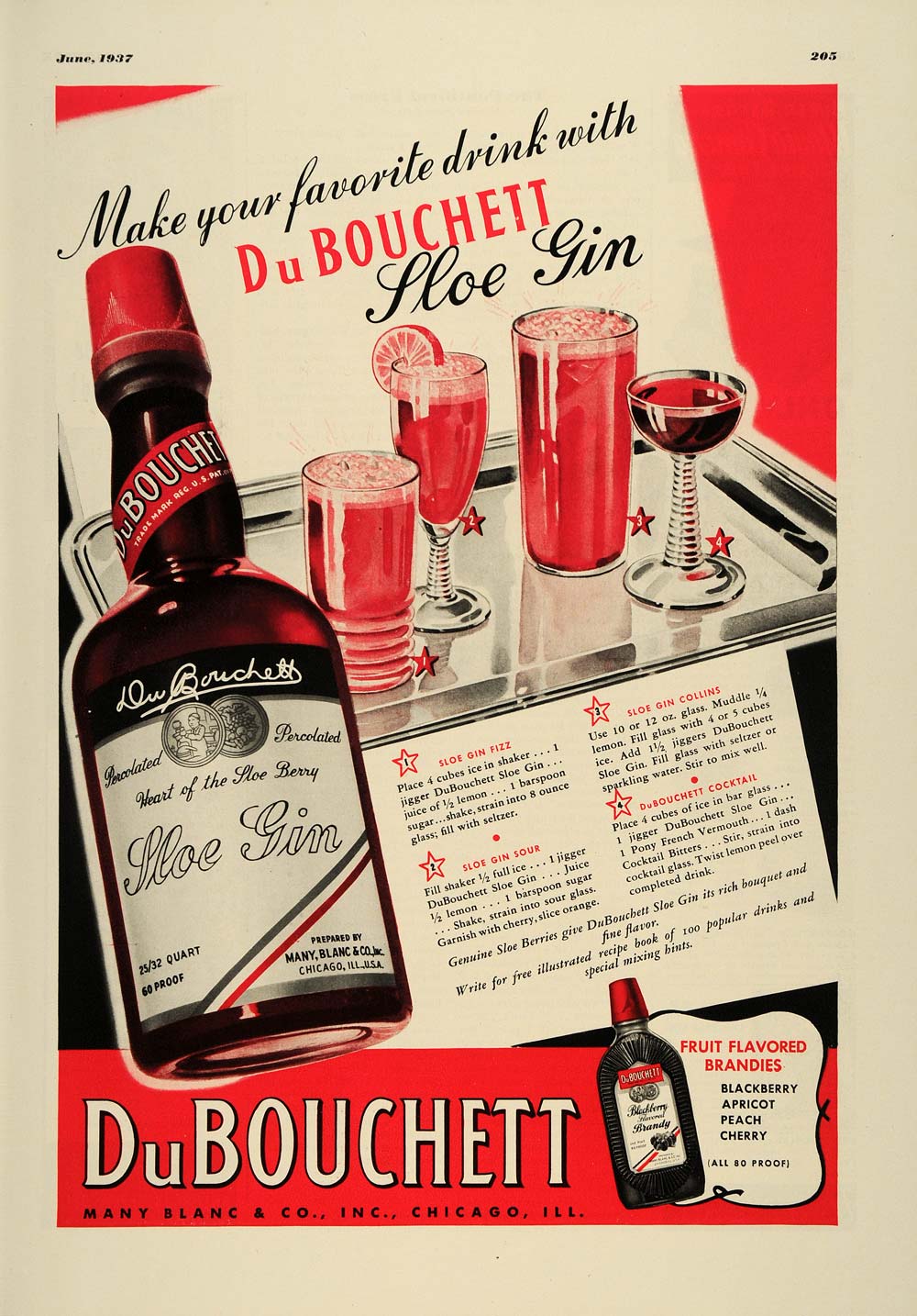 This is an original 1937 color print ad for DuBouchett Gin from the Many Blanc & Co. located in Chicago, Illinois.