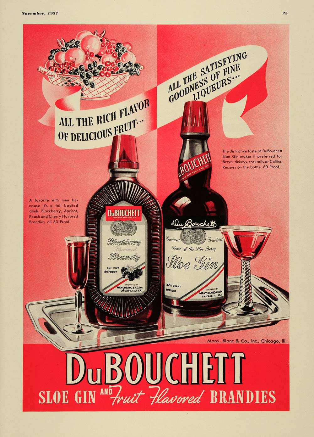 This is an original 1937 color print ad for DuBouchett Sloe Gin and Fruit Flavored Brandies by Many, Blanc & Comany, Inc. of Chicago, Illinois.