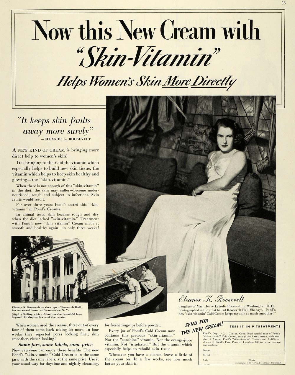 This is an original 1937 black and white print ad for Pond's Cold Cream and other beauty products by the Pond's Extract Company. This ad features Eleanor K. Roosevelt, there are pictures of her outside on the steps of Roosevelt Hall in Skaneateles, New York and in the great hall.