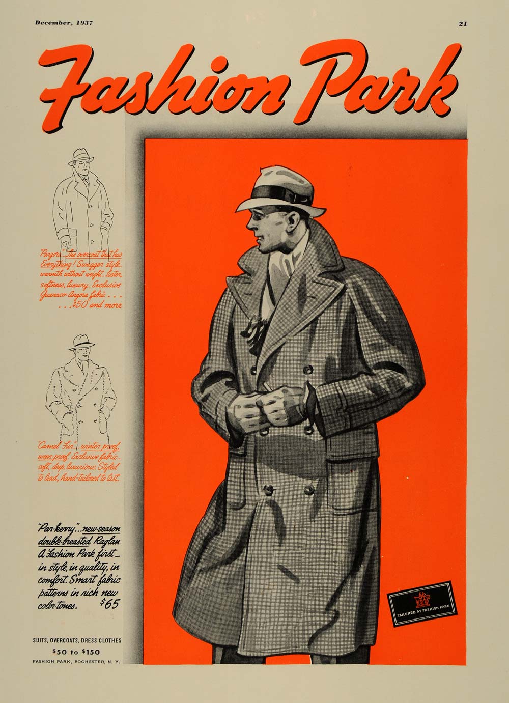 This is an original 1937 color print ad for Fashion Park suits, overcoats and dress clothes.