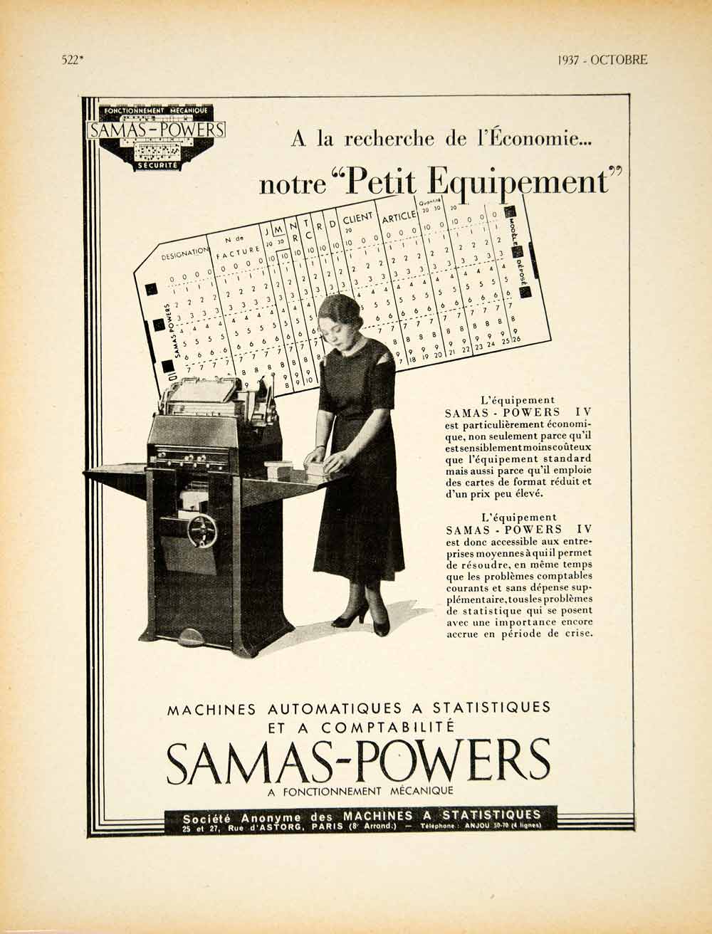 This is an original 1937 black and white French print ad for Samas-Powers keypunch machines for statistics and accounting.