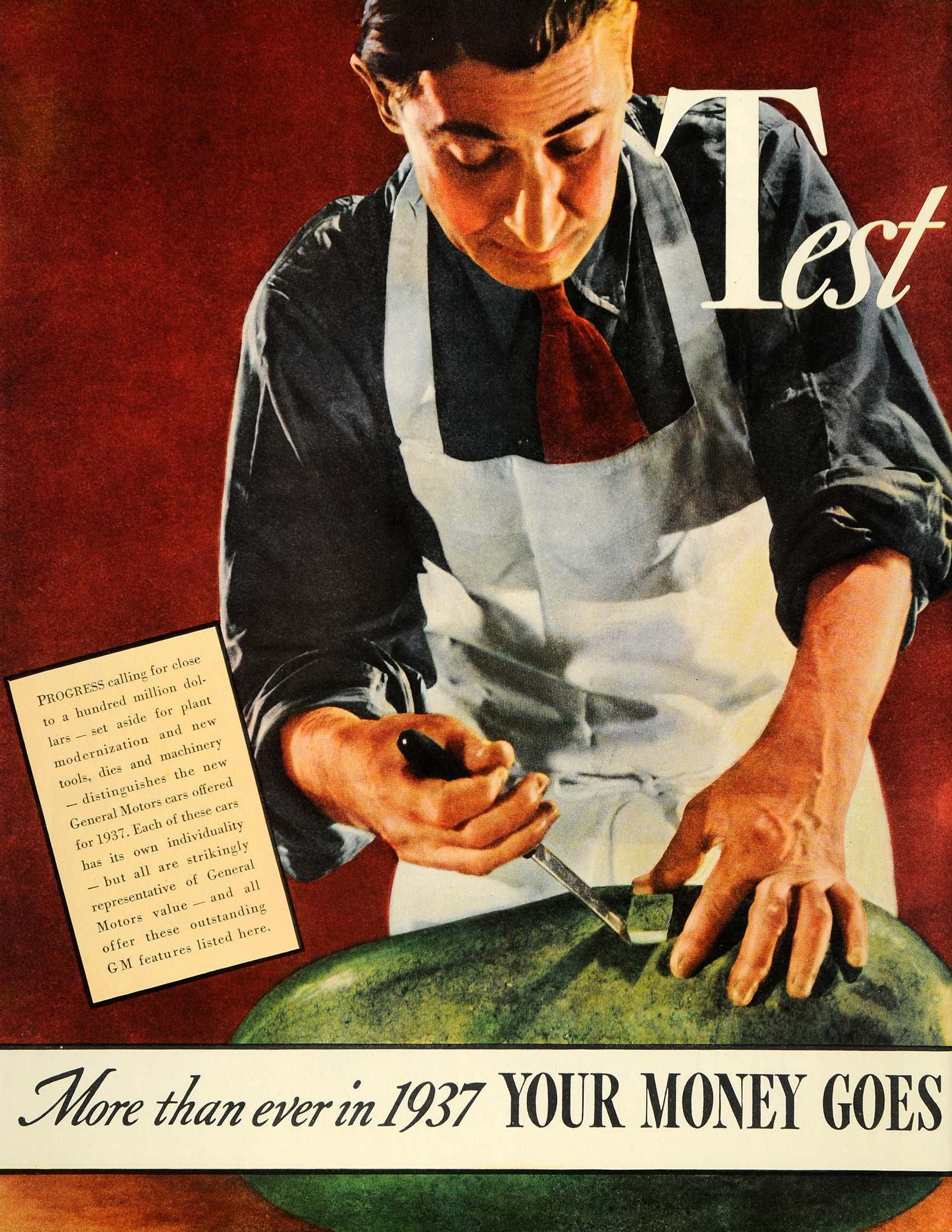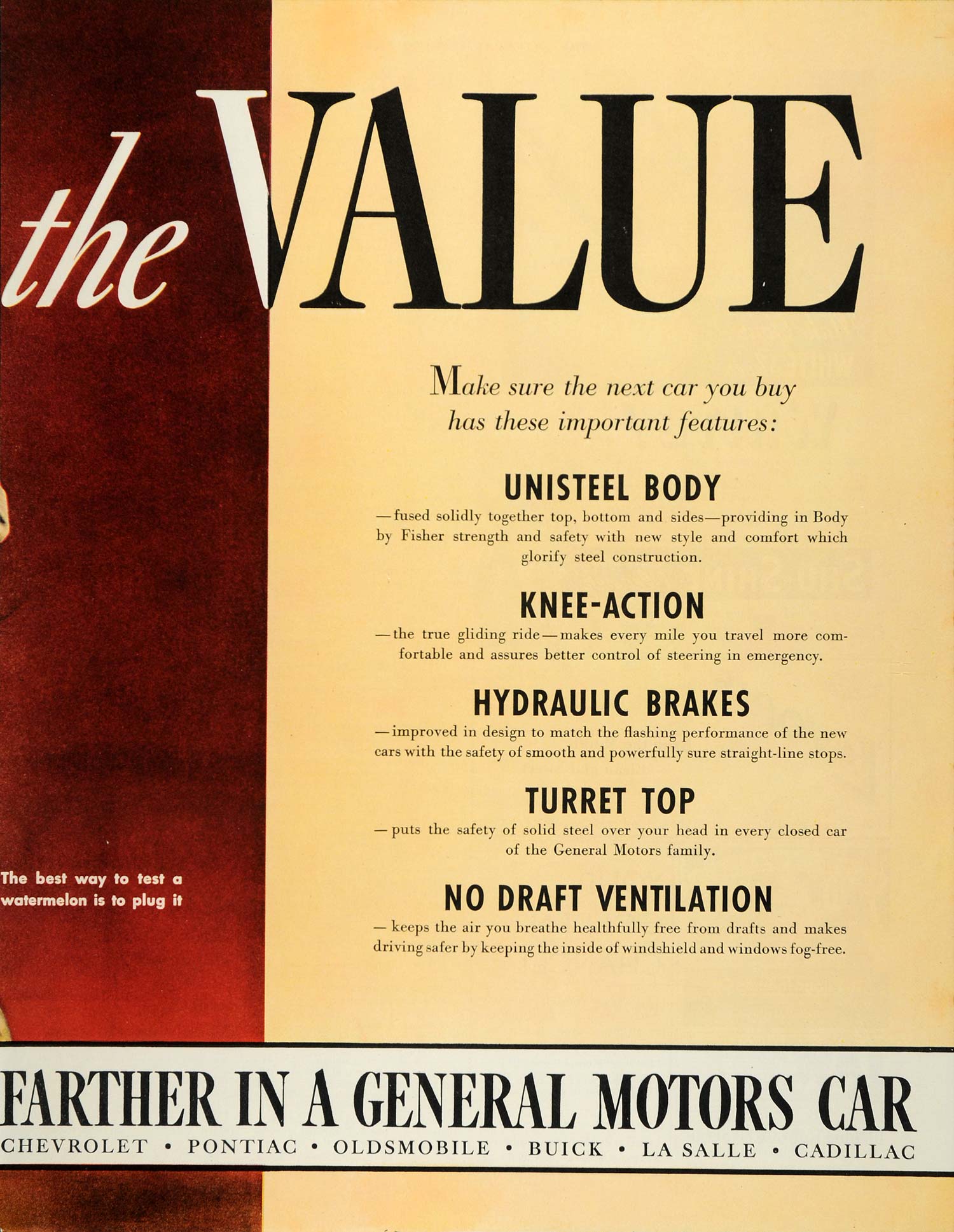This is an original 1937 color two-page print ad promoting the important features of General Motor vehicles.
