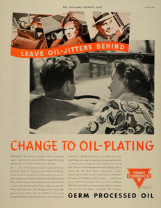 This is an original 1937 color print ad for Oil-Plating Germ Processed Oil by the Continental Oil Company and available at your Conoco Mileage Merchant.
