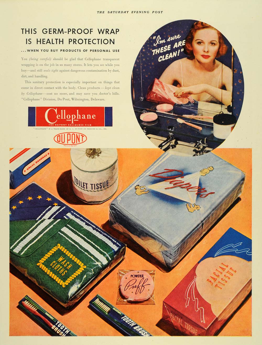This is an original 1937 color print ad for Du Pont Cellophane by the Du Pont Cellophane Company, Inc. located in Wilmington, Delaware.