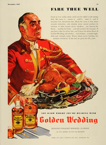 This is an original 1937 color print ad for Golden Wedding, blended straight whiskies, 90 proof in rye or bourbon. This alcoholic beverage is by Jos. S. Finch & Company, Inc. of Schenley, Pennsylvania.