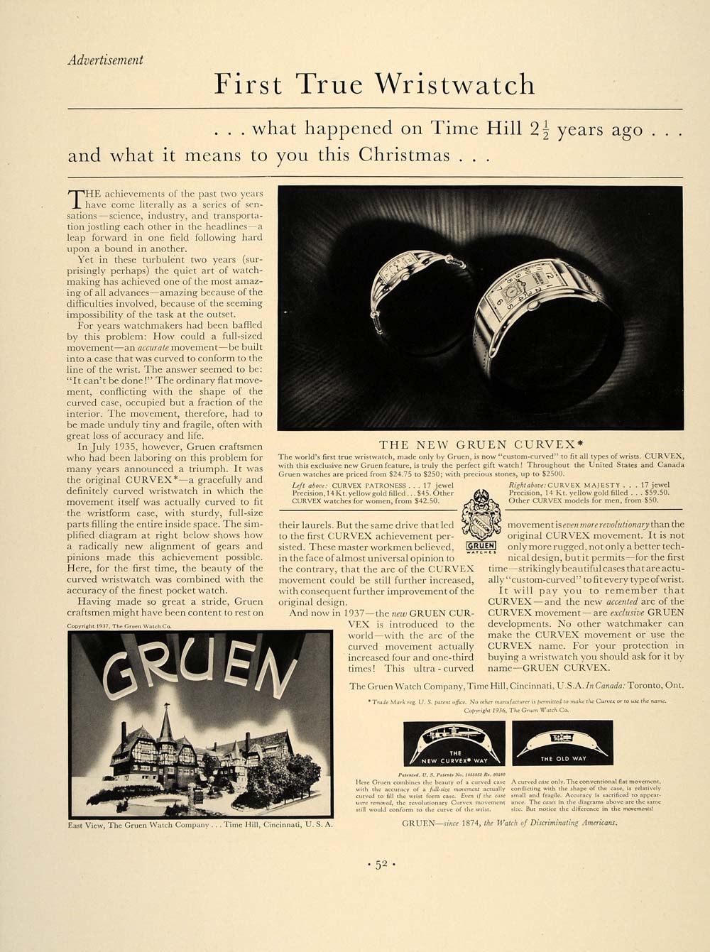 This is an original 1937 black and white print ad for Gruen Curvex watches from The Gruen Watch Company, Time Hill, Cincinnati Ohio.