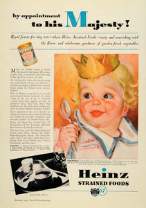 Keywords specific to this image: king, crown, baby, infant, child, spoon, bib, meal, eat, canned, peas, green beans, spinach, carrots, beets, prunes, tomatoes, Majesty, tot, baby food Vintage Advertising