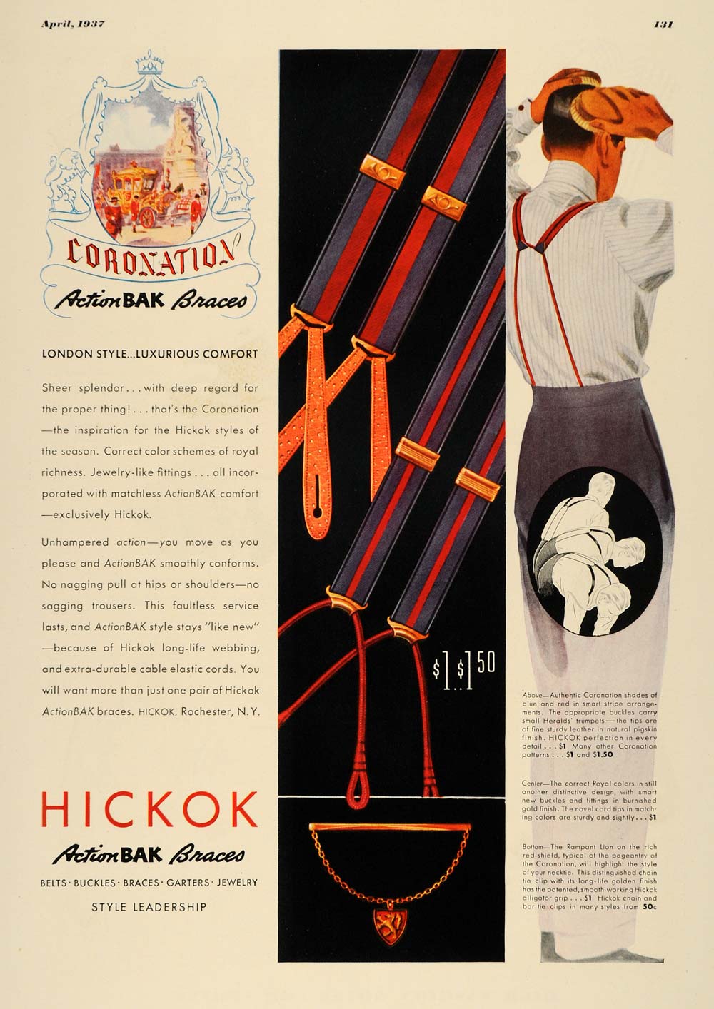This is an original 1937 color print ad for Hickok ActionBAK Braces for men, as well as additional menswear and accessories including belts, garters. buckles, jewelry and more.