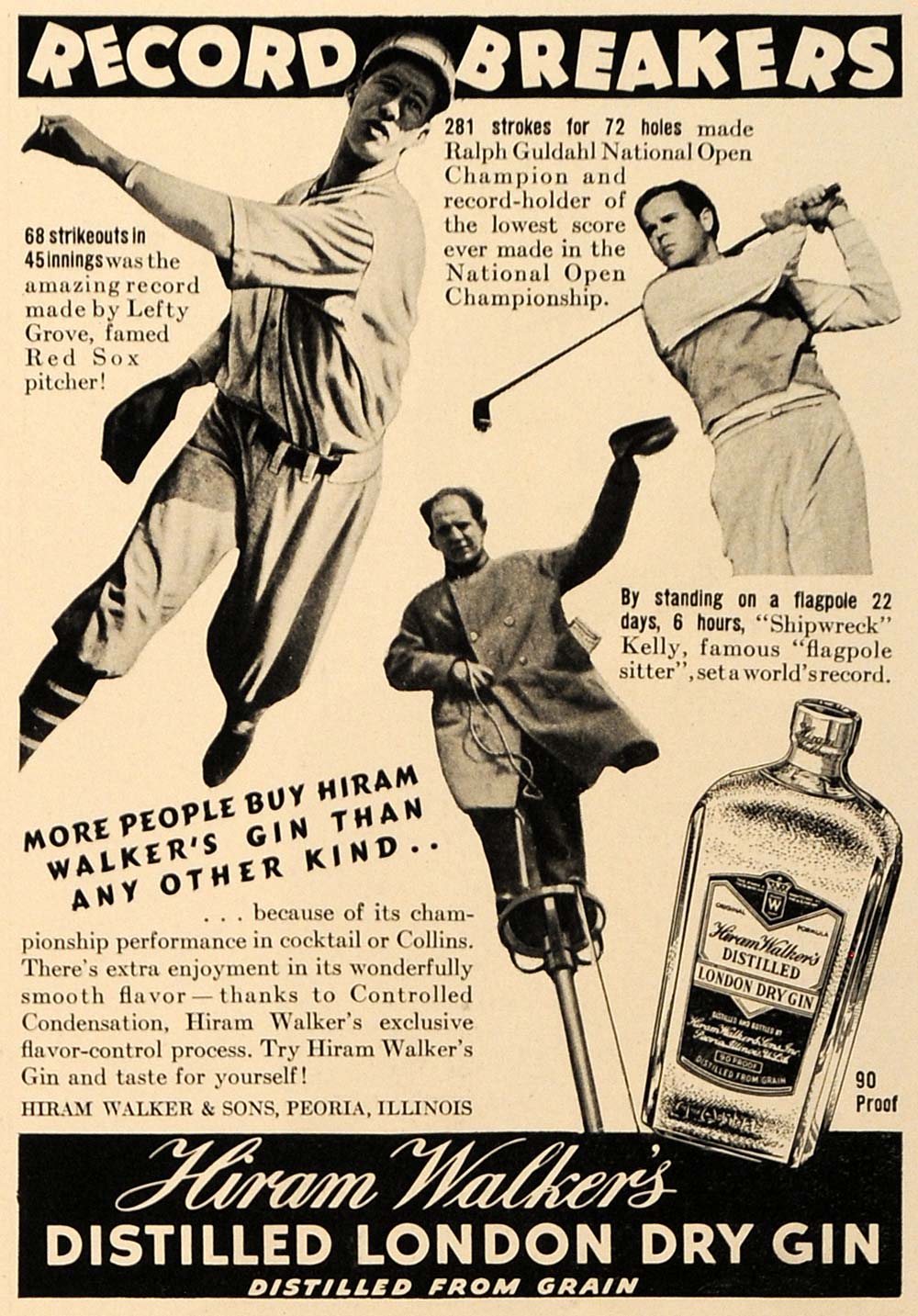 This is an original 1937 black and white print ad for Hiram Walker's Distilled London Dry Gin. The ad features images of Lefty Grove, the Red Sox pitcher, Ralph Guldahl, the National Open Champion, and "Shipwreck" Kelly, the famous flagpole sitter.