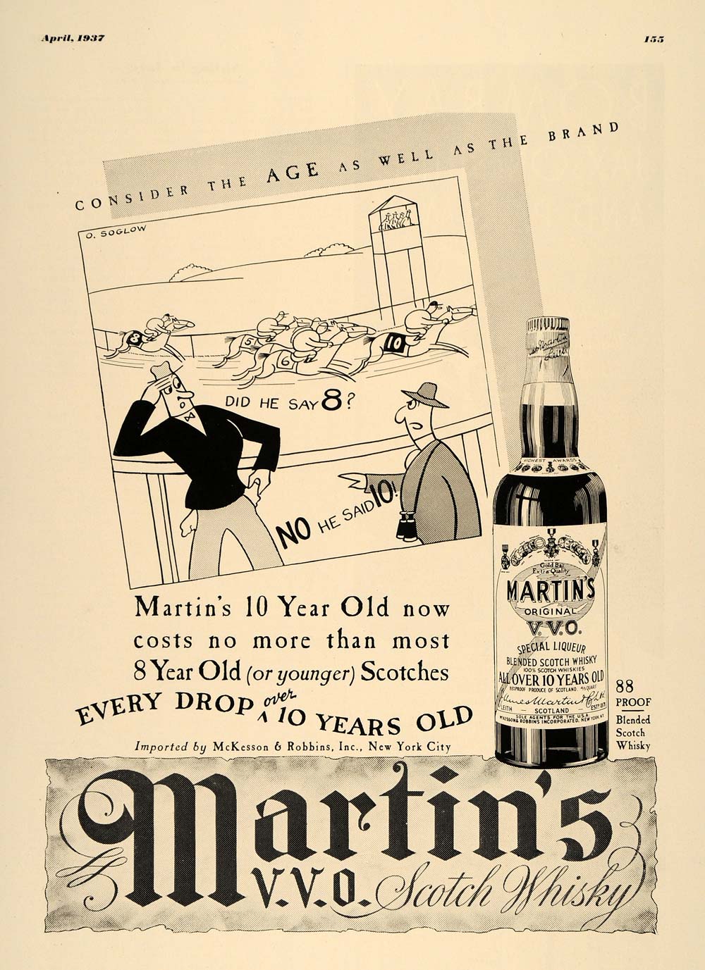 This is an original 1937 black and white print ad for Martin's V. V. O. Scotch Whisky, a product by McKesson and Robbins in New York City. This particular ad features artwork by Otto Soglow of two men betting on a horse race.