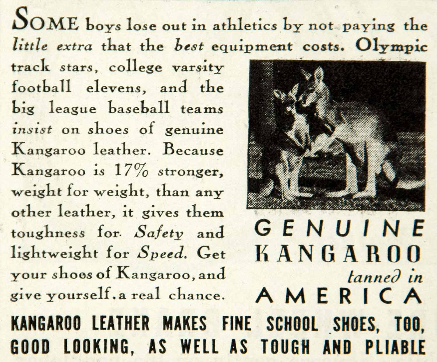 This is an original 1937 black and white print ad for boys athletic shoes that were made out of genuine Kangaroo leather that was tanned in America.